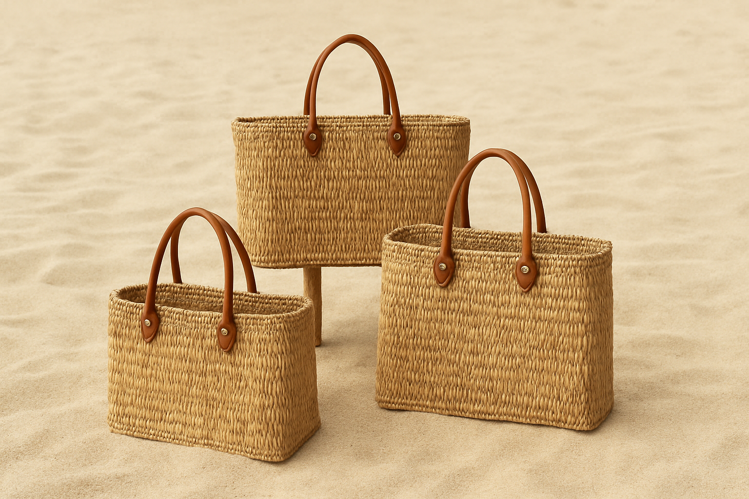 Woven from 100% natural raffia and finished with premium leather handles, it blends tradition with modern coastal elegance.